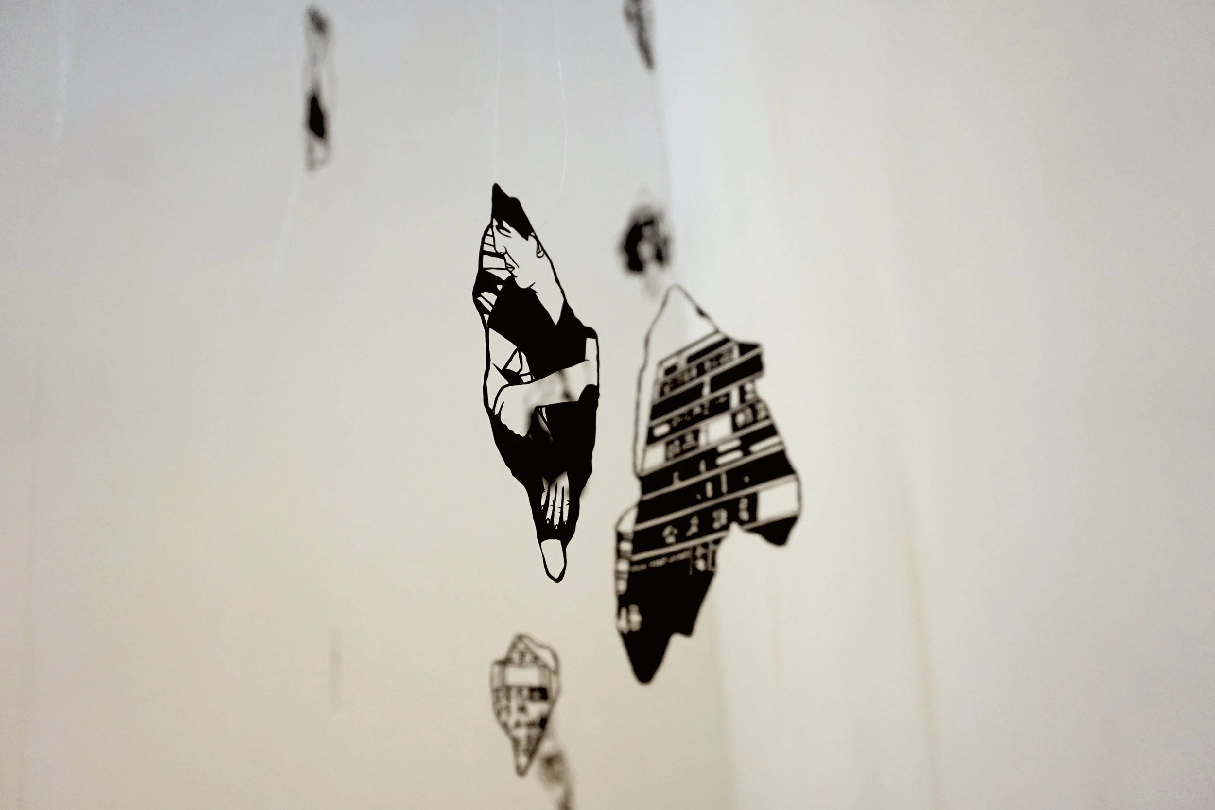 Site Specific installation, manual paper-cutting, threads, framed black paper