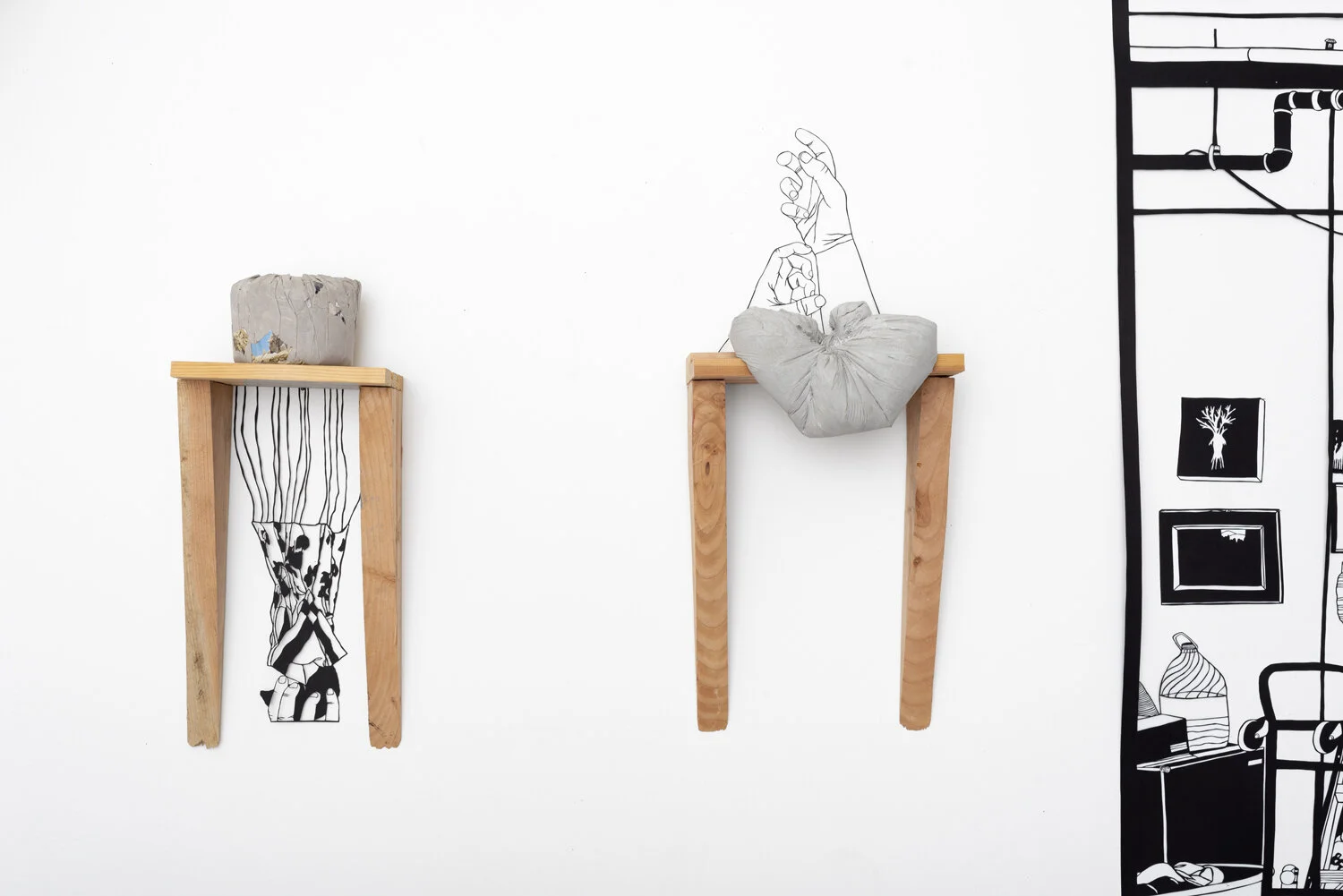 Born in California to a Japanese mother and Israeli father, and moving to Israel as a child, Yekutieli imposed questions of belonging and home from the very beginning of her life, waiving the option of a singular origin and perhaps above all belonging to her studio. In this series of works, Yekutieli photographed her studio in transitioning moments and transformed them into manual paper-cutting, by doing so, she emphasizes the blurry boundaries of what is part of a narrative, and what is left out of it. Various narratives are contained within a singular piece of paper, presenting a multi-layered presence; an artwork inside an artwork, a frame within a frame, and narratives overlapping narratives. She parallels the belongings of the objects to different stories within the work to her own overlapping associations. Such as each person has a past that can be read from different points of view; also objects tend to belong to different contexts.